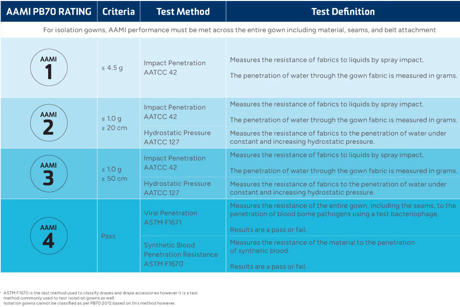 The AAMI PB70 standard specifies the performance metrics for liquid barrier performance and classification of protective apparel for use in healthcare facilities. The standard offers four levels of barrier protection ranging from AAMI 1 to AAMI 4.